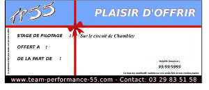 COMMENT OFFRIR UN CHEQUE CADEAU ![]() Vous avez la possibilité d’offrir un chèque cadeau valable sur toutes les journées TP55 proposées sur notre site, sous réserve de place disponible, sur les pneus, pièces d’entretien ou sur les pièces racing. Ce chèque cadeau ne peut pas être utilisé sur les dates en partenariat. Pour cela il suffit : PAR COURRIER Vous devez imprimer le bon de commande disponible ici, le remplir distinctement (lisible). Ensuite vous devez nous le renvoyer accompagné d'un chèque à : Team Performance 55 – 4 rue de l’abattoir – 55400 ETAIN. Le chèque sera encaissé à réception. ATTENTION POUR LES CHEQUES CADEAUX TARDIFS : Pensez aux "jours de roulage", "jours ouvrés" et "jours de poste". Si vous envoyez votre bon de commande le jeudi soir, il sera traité au mieux le lundi, sauf si nous sommes en événement, dans ce cas il sera traité mardi voir mercredi. Comptez 2 à 3 jours de plus pour le retour par la poste. PAR MAIL Vous devez imprimer le bon de commande disponibleici, le remplir distinctement (lisible). Ensuite vous devez nous le renvoyer à tp55@orange.fren nous précisant le mode de règlement choisi. EN LIGNE Vous devez créer un compte, ou vous connecter à votre compte déjà existant, et ajouter le ou les chèques cadeau à votre panier. Si vous créez un compte spécialement pour la commande du chèque cadeau, merci de mettre un caractère au choix (?, -, *, ...). Ces inforamtions seront remplies âr le bénéficaire du chèque cadeau lors du choix de sa date. Vous pouvez egalement nous indiquer le nom et prénom du bénéficiare dans la case "divers" sur la page information pilote mais ce n'est plus obligatoire. Vous pourrez ensuite régler votre achat en ligne, par CB, par courrier ou par virement (voir section Modalité de paiement). ATTENTION : Si vous voulez 2 chèques cadeau, de 140 € par exemple, il faudra faire 2 commandes différentes. ENVOI DU CHEQUE CADEAU Le chèque cadeau vous sera envoyé par mail, il pourra également vous être envoyé par courrier sur demande. Il ne sera activé sur notre site qu'à réception du règlement. Vous recevrez votre chèque cadeau à l’adresse mail indiquée sur le bon de commande. Si vous souhaitez le recevoir pour l’offrir en main propre, merci d’indiquer votre adresse de livraison lors de la commande. |